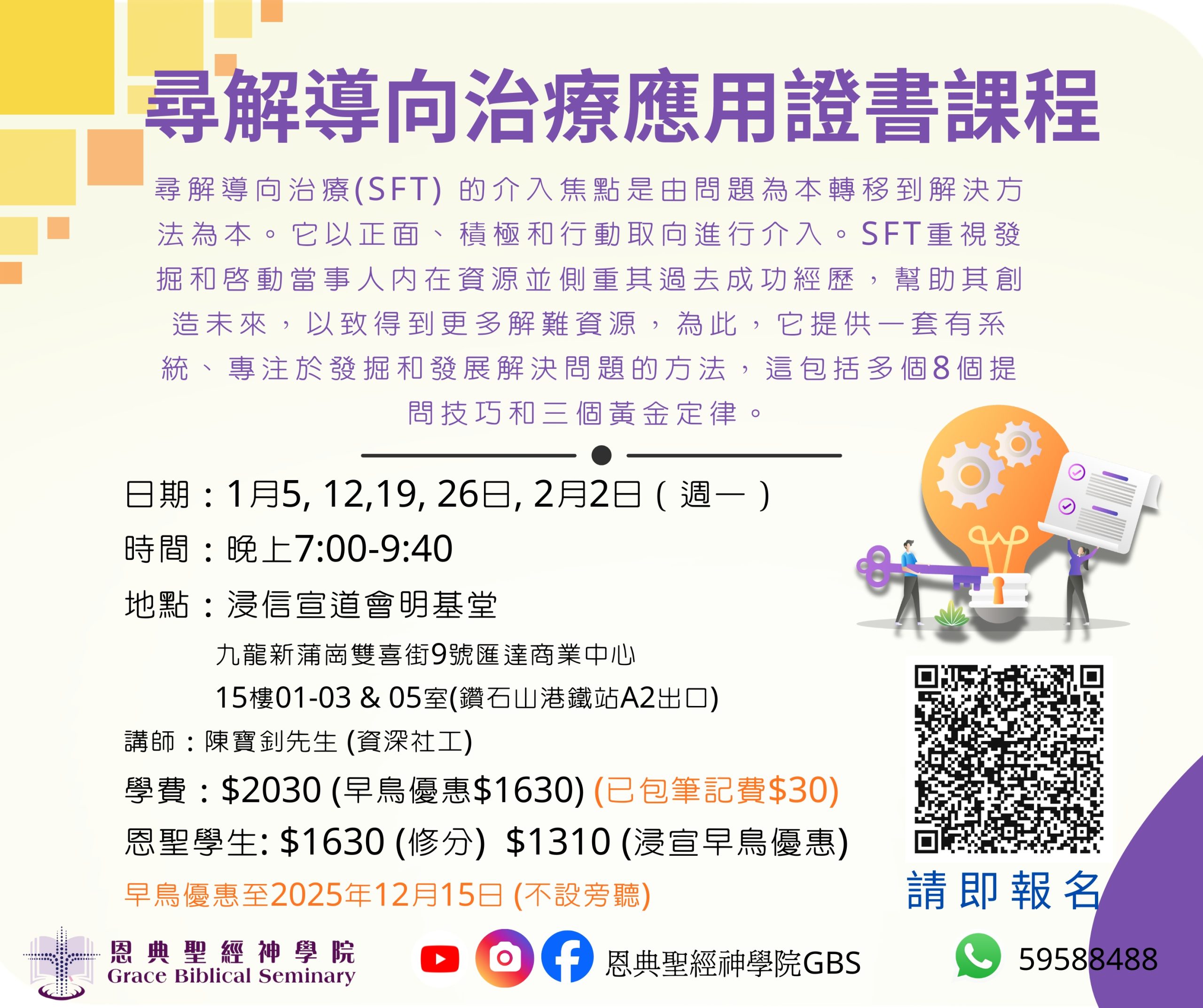 尋解導向治療應用證書課程 日期:1月5, 12,19, 26日, 2月2日(週一)時間:晚上7:00-9:40地點:浸信宣道會明基堂(九龍新蒲崗雙喜街9號匯達商業中心15樓01-03 & 05室)(鑽石山港鐵站A2出口)講師:陳寶釗先生 (資深社工)學費:$2030 (早鳥優惠$1630)恩聖學生: $1630 (修分) $1310 (浸宣早鳥優惠)早鳥優惠至2025年12月15日(已包筆記費$30) (不設旁聽) 下載課程大綱 報名費可用以下方法繳交:1. 請開具劃線支票,抬頭「恩典聖經神學院有限公司」(Grace Biblical Seminary Co. Ltd.)2. 存款至以下銀行賬戶:中國銀行(香港) 往來戶口號碼:012-581-2-018653-6東亞銀行 往來戶口號碼:015-515-68-01828-8 CUR3. 用轉數快,查找手機號碼 59855488,確定賬戶為 「Grace Biblical Seminary Co. Ltd.」存款後請將入數紙,寫上姓名及報讀課程名稱,經電郵/WhatsApp 寄回本院。 Notice: JavaScript is required for this content.