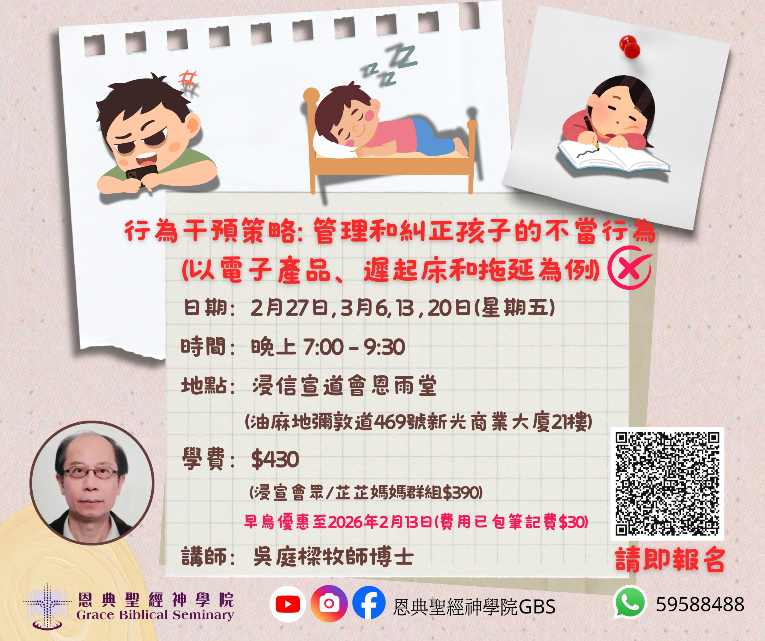 行為干預策略: 管理和糾正孩子的不當行為 日期:2月27日, 3月6, 13 , 20日(週五) (1學分) [家長學] 時間:晚上 7:00 – 9:30 地點:浸信宣道會恩雨堂 (油麻地彌敦道469號新光商業大廈21樓) 學費:$430 (浸宣會眾/芷芷媽媽群組早鳥優惠$390) 早鳥優惠至2026年2月13日(費用已包筆記費$30) 講師:吳庭樑牧師博士 下載課程大綱 報名費可用以下方法繳交:1. 請開具劃線支票,抬頭「恩典聖經神學院有限公司」(Grace Biblical Seminary Co. Ltd.)2. 存款至以下銀行賬戶:中國銀行(香港) 往來戶口號碼:012-581-2-018653-6東亞銀行 往來戶口號碼:015-515-68-01828-8 CUR3. 用轉數快,查找手機號碼 59855488,確定賬戶為 「Grace Biblical Seminary Co. Ltd.」存款後請將入數紙,寫上姓名及報讀課程名稱,經電郵/WhatsApp 寄回本院。 Notice: JavaScript is required for this content.